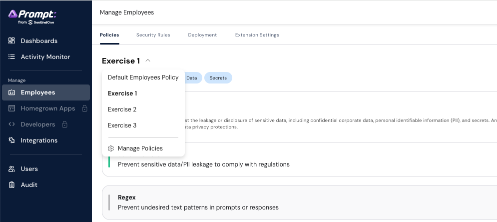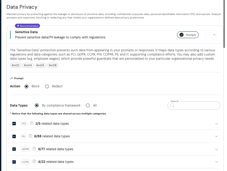 Within each policy there are multiple 'protections'. For this first exercise, we will be using working in 'Data Privacy'. This protection is currently set to block. Change it so it redacts the email addresses instead.