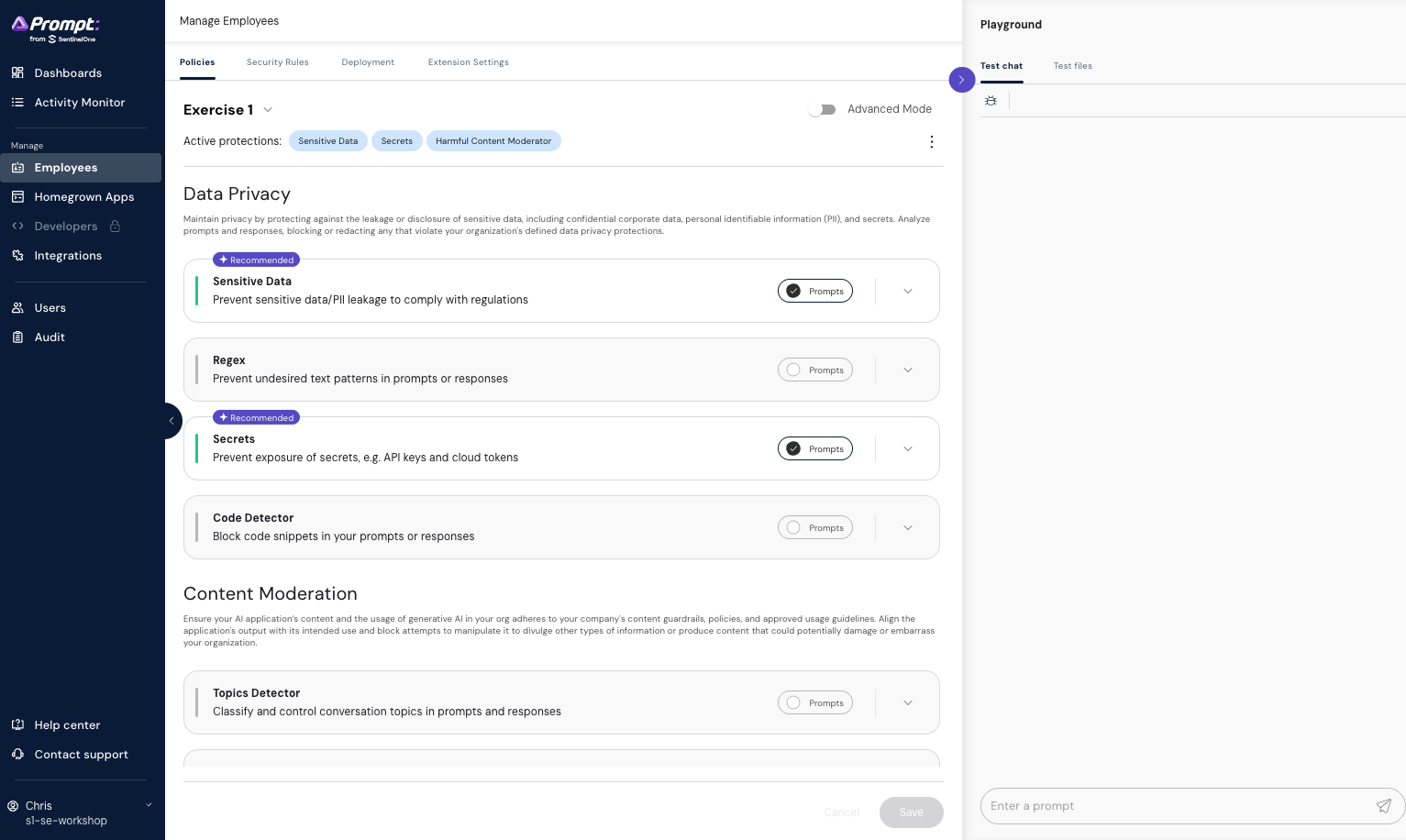 In the blue menu on the left, select the 'Employees' option to access the playground and policies.